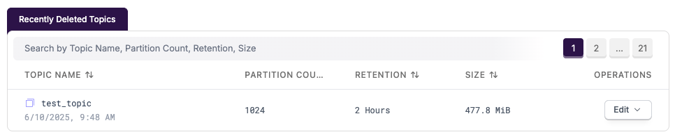 When you delete a topic from a Kafka client, the WarpStream API, or the console, you will no longer be able to produce to or consume from the topic. However, WarpStream will retain the data and allow you to restore the topic. Once a topic is restored, you will be able to resume producing and consuming. The default retention period for soft-deleted topics is 24 hours.