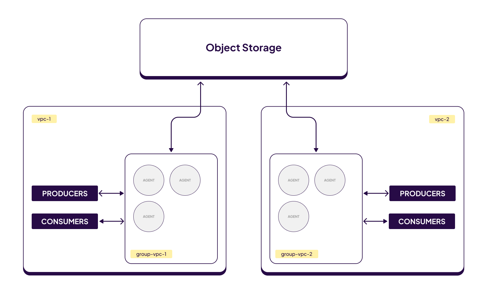 In the diagram above producer and consumer clients running in `vpc_1` will only ever connect to Agents running in `group_vpc_1`. Similarly, producers and consumer running in `vpc_2` will only ever connect to Agents running in `group_vpc_2`. However, since both Agent Groups belong to the same logical virtual cluster and have access to the same object storage bucket, clients in each VPC will be able to write and read data for all topics and partitions, even those that were created by clients / Agents running in a completely different VPC!