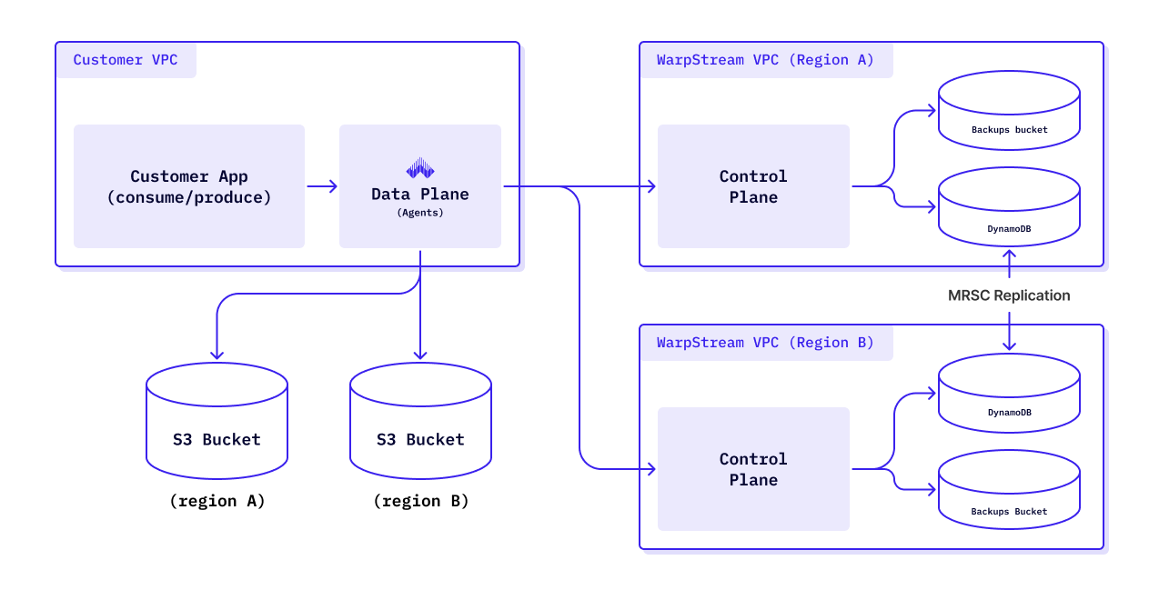 For details on the internals of multi-region control planes, see the related [blog post](https://www.warpstream.com/blog/no-record-left-behind-how-warpstream-can-withstand-cloud-provider-regional-outages). The main idea is that the control plane will replicate your metadata across regions, so that if one fails there is always a copy remaining. The agents that form your data plane will talk to one of these regional control planes at any given time, falling back to the other regions if one of them is degraded. Your agents will only talk to a single region at a given time to avoid writing conflicts on the metadata storage, which would impact throughput and latency.