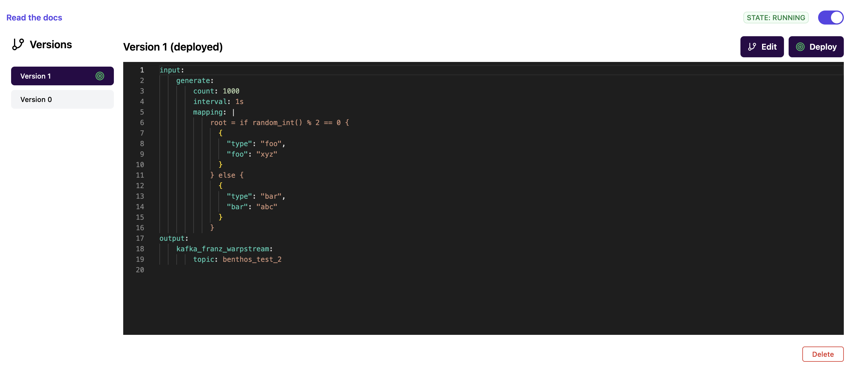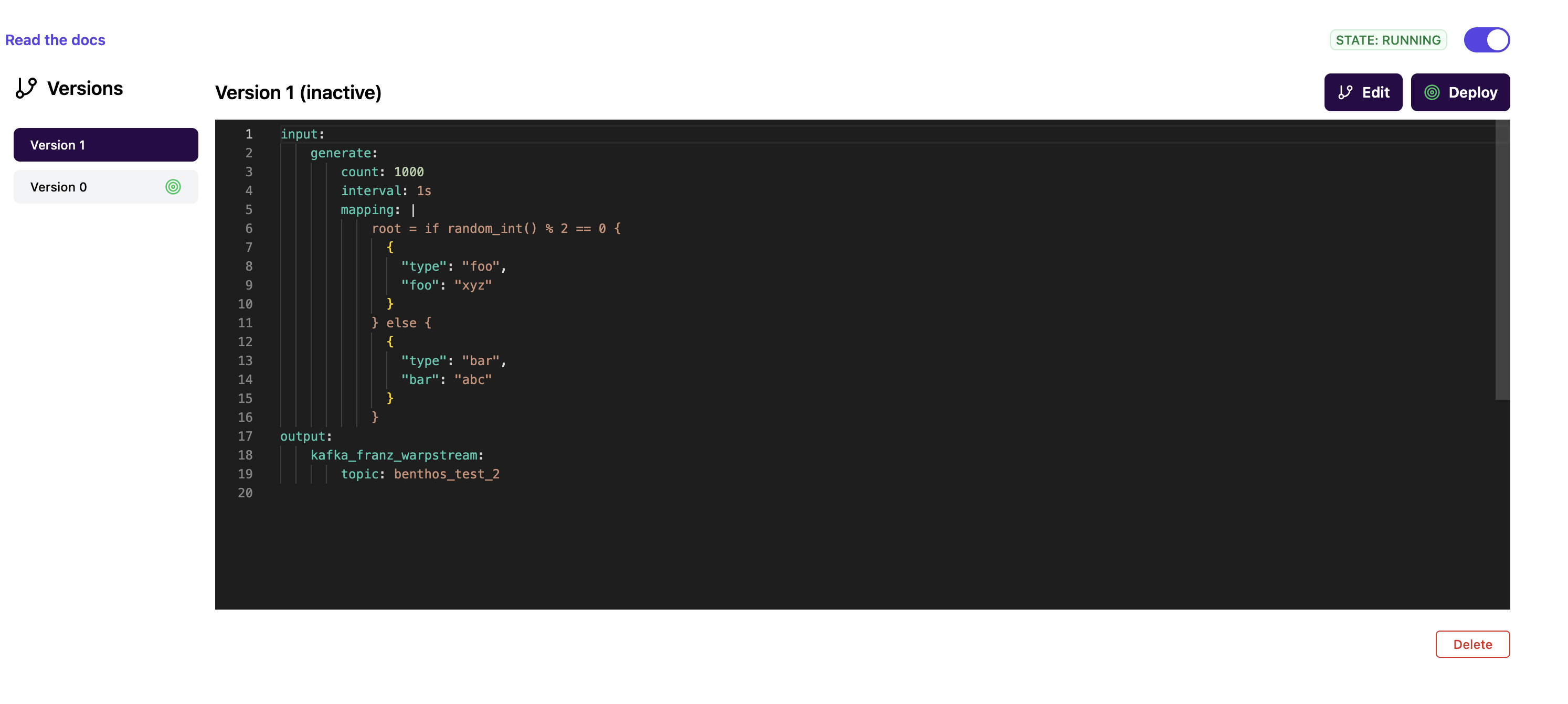 Note that even though we edited the pipeline configuration, the old version is still running, that's why there is a green target symbol next to "Version 0". This indicates that even though "Version 1" is the latest version, the version that is *currently deployed* is "Version 0". This keeps the process of editing configuration separate from the process of deploying configuration.