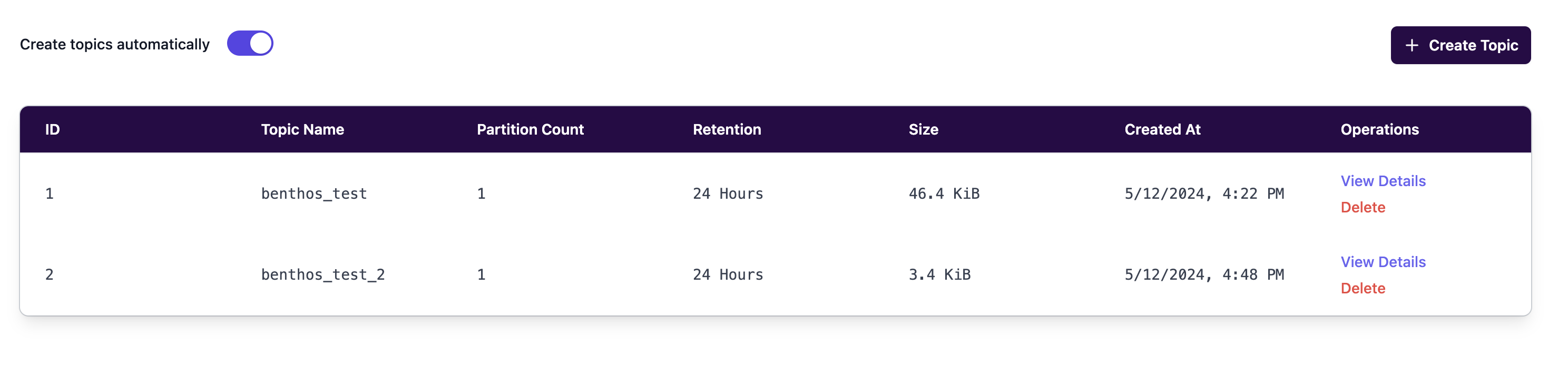 Navigate back to the topics tab, and you should see the new "bento\_test\_2" topic now!