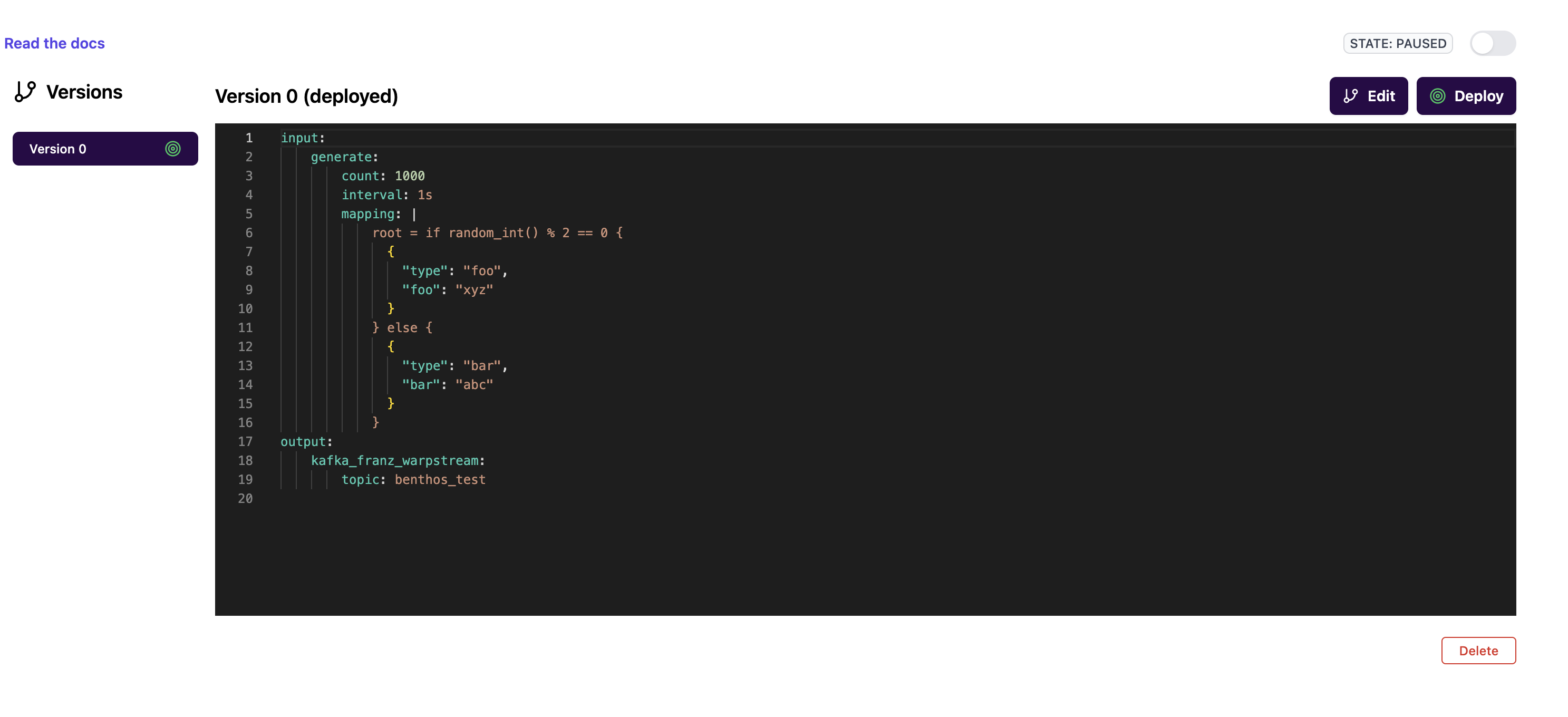 The configuration is now saved and "deployed", but it's not running yet. Click the toggle button next to where it says "PAUSED" to start running the pipeline.